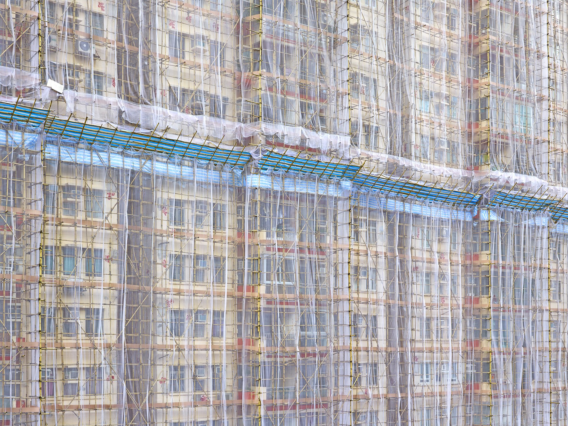Once a practice throughout Asia, Hong Kong is the final stronghold of the bamboo scaffolders. Caged in bamboo up to 80 stories durning renovation, then covered in different colored material to eliminate debris falling to the ground. The title "Cocoon" for the body of work was a natural choice. The framework; a metamorphosis; like caterpillars to butterflies. Colored material unveiled ceremoniously reveals a brand new facade, as in a cocoon revealing itself for the first time. Photographed first in 1994 and 1995, this idea became a full time project in 2007 when relocating to Hong Kong from Vietnam. It was published by Powerhouse Books January 2019.